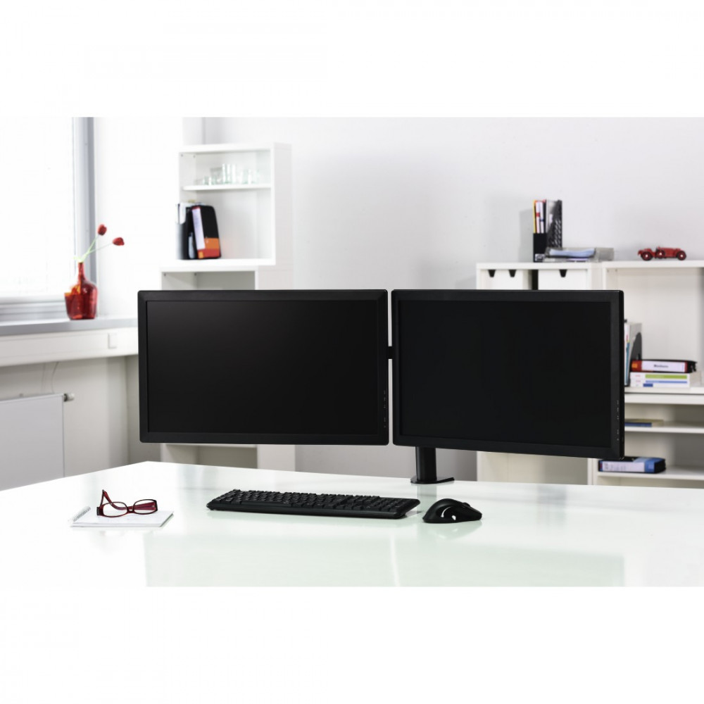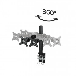 Stolový držiak Hama umožňuje pripevnenie až dvoch monitorov s veľkosťou 10 - 26 palcov. Zvyšuje tak komfort práce s dvoma displejmi vedľa seba. Pýši sa robustným, veľmi kvalitným vyhotovením a jednoduchým nastavením, k čomu slúži trojica kĺbov na každom ramene. Tie dovoľujú otočenie o 360° podľa zvislej osi (do strán) aj vodorovnej osi (pivot). Iste oceníte aj možnosť naklápania v rozsahu +/- 90°. Dĺžka ramena je 36,2cm. K stolu držiak pripevníte pomocou skrutkovacej svorky - doska stola môže mať maximálnu hrúbku 9,5cm. Veľkou výhodou sú tiež prvky na vedenie káblov, ktoré sa tak nebudú voľne povaľovať na stole. Súčasťou balenia je tiež montážne príslušenstvo.
